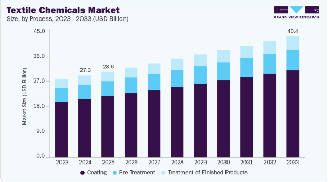 繊維化学品産業の成長は、デジタル印刷、ナノテクノロジー、スマートテキスタイルなど、性能と機能性を高める高度な化学品を必要とする製造技術革新によって牽引されている。中国、インド、バングラデシュなどの主要繊維生産国は、支援政策とコスト優位性により生産を拡大している。例えば2024年、インド政府は繊維産業強化のため1000億ルピー以上を配分し、うち600億ルピーをインド綿花公社に充てるなど、強力な政府支援が示された。