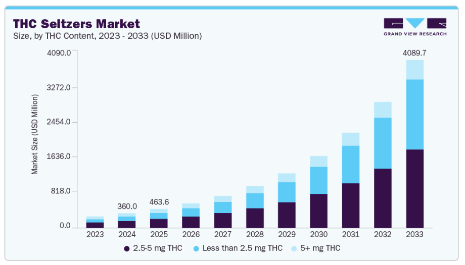 より多くの管轄区域で大麻の販売および消費が非犯罪化・規制されるにつれ、炭酸水を含むTHC含有製品の市場は大幅に拡大しております。