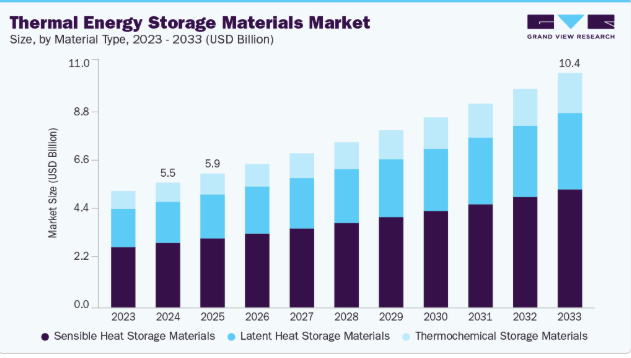 熱エネルギー貯蔵材料産業の主要な推進要因には、再生可能エネルギーの導入拡大、スマートグリッドインフラへの投資増加、産業廃棄熱回収アプリケーションの増加が含まれる。相変化材料(PCM)と溶融塩の需要は、最小限のエネルギー損失で長期間熱を貯蔵できる特性から拡大している。より高い貯蔵密度と運用効率を提供する熱化学材料の進歩が市場成長を加速させている。電化暖房・冷房への移行と産業近代化が相まって、採用をさらに促進している。さらに、企業の持続可能性目標と信頼性の高いオフグリッド電力ソリューションへの需要増大が、世界的にTES材料の重要性を高めている。