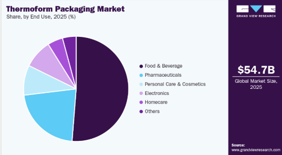 食品・飲料セグメントは、世界の熱成形包装業界において最大のシェアを占め、2025年には売上高の51.2%を占める見込みです。その優位性は、加工食品メーカー、ファストフード店、外食産業において、容器、トレイ、クラムシェルが広く使用されていることに支えられています。消費者のライフスタイルがより利便性を重視する方向へとシフトし続ける中、即食食品、持ち運び用スナック、およびパッケージ化された食料品への需要は、このセグメントにおける熱成形ソリューションの採用をさらに後押しすると予想されます。しかし、成形繊維や紙ベースの形態を含む持続可能な代替品への移行が進んでいることは、長期的には成長のペースを鈍化させる可能性があります。