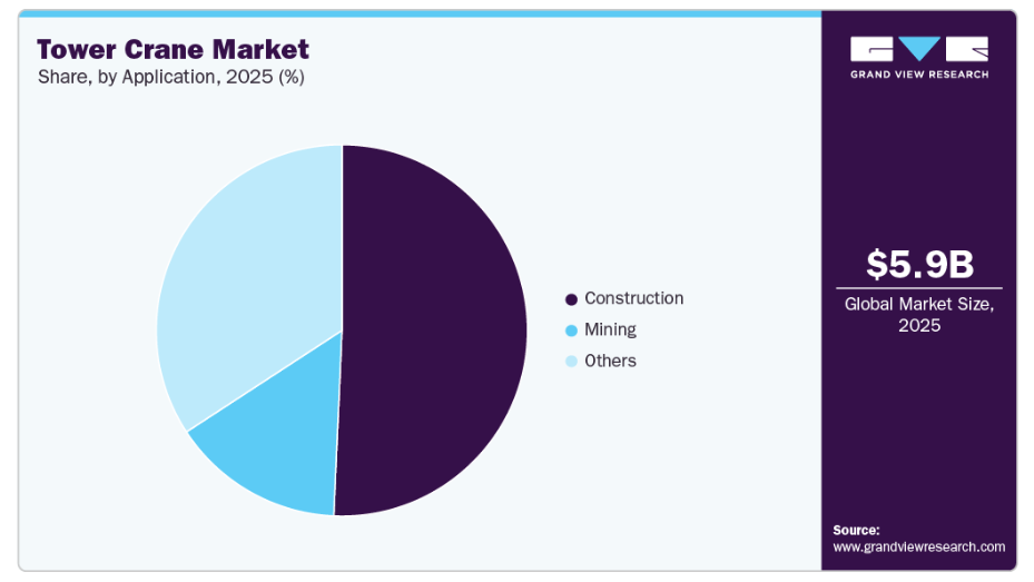 2025年には、トップ旋回クレーンセグメントが最大の売上シェアを占めました。これらのクレーンは、優れた吊り上げ性能、安定性、およびより高い位置での重量物の取り扱い能力を備えているため、主要なインフラプロジェクトや高層開発で広く使用されています。トップ旋回クレーンは、商業タワー、産業施設、橋梁、地下鉄建設などの複雑なプロジェクトに特に適しています。新興国および先進国における都市インフラの拡張やメガ建設プログラムへの投資増加が、このセグメントの需要をさらに後押ししています。その耐久性、運用効率、および長期プロジェクトへの適性は、トップ旋回クレーンが引き続き優位性を維持する主な要因となっています。