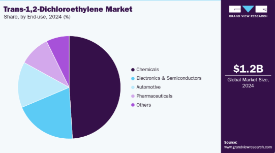 電子・半導体セグメントは、チップ製造や高精度部品製造における超清浄溶剤の需要拡大を背景に、予測期間中に7.2%という最速のCAGR(年平均成長率)が見込まれる。1,2-トランス-DCEの高純度と優れた洗浄性能は、ウエハー処理や先進的な電子アセンブリに不可欠である。半導体生産能力拡大に向けた世界的な投資が、さらなる需要拡大を加速させている。技術の高度化が進むことで、このセグメントの成長軌道はさらに強化され続けている。