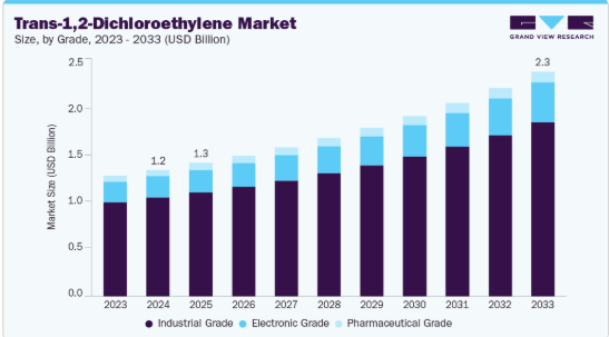 本レポートは、2018年から2033年までの各サブセグメントにおける最新の業界動向分析を提供するとともに、グローバル、地域、国レベルでの収益成長を予測します。本調査では、Grand View Researchはグレード、用途、エンドユース、地域に基づいてグローバルトランス-1,2-ジクロロエチレン市場レポートをセグメント化しています: