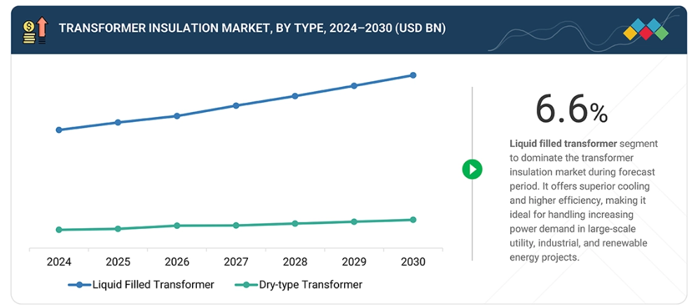 変圧器絶縁材市場は、種類別に液体充填変圧器と乾式変圧器に分類されます。液体充填変圧器は、優れた効率性、強化された冷却性能、および延長された耐用年数により、市場を支配しています。この種類の変圧器は高電圧負荷を処理する能力を有し、さらに大規模電力事業や産業用途での広範な採用が、市場における優位性をさらに強固にしております。