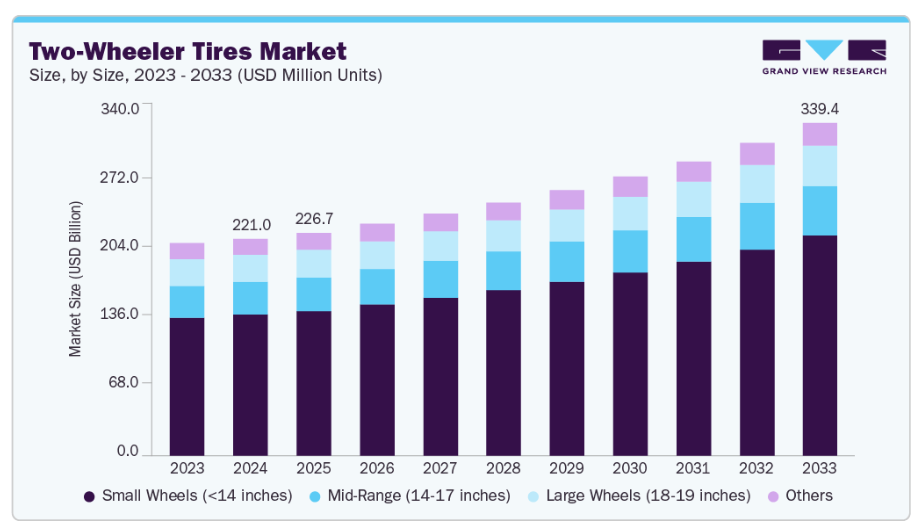 都市化の進展と交通渋滞の増加に伴い、二輪車は手頃な価格と利便性から個人移動手段として好まれるようになりました。可処分所得の増加と費用対効果の高い融資オプションの普及が、車両販売をさらに促進し、結果としてタイヤ需要を刺激しています。加えて、電子商取引プラットフォームと物流サービスの拡大により、ラストマイル配送におけるオートバイの利用が増加しています。この商業利用の急増を受け、タイヤメーカーは過酷な日常運用に適した耐久性と高性能を備えた製品の開発を進めています。