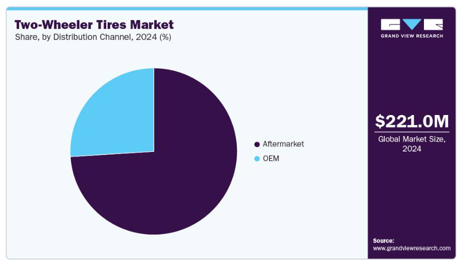 アフターマーケットセグメントは市場を牽引し、2024年には74.0%という最大の収益シェアを占めました。これは、タイヤの摩耗、パンク、性能向上のための交換需要の増加が背景にあります。特に人口密集都市部における二輪車利用の増加は、タイヤの摩耗を促進し、交換サイクルを加速させています。消費者は安全性、信頼性、走行距離の向上を理由に、ブランド品や高性能タイヤをますます好む傾向にあります。サービスセンターの拡大とオンライン小売プラットフォームの普及により、タイヤの入手はより便利になりました。さらに、メンテナンス文化の浸透と道路安全への意識向上も、アフターマーケットセグメントの着実な成長に寄与しています。