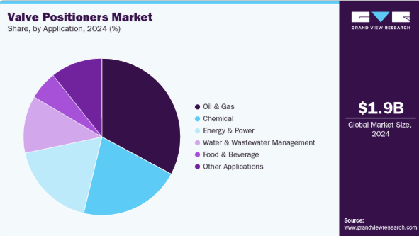 市場はエネルギー・電力、化学、石油・ガス、水・廃水管理、食品・飲料に区分される。このうち石油・ガス用途セグメントは2024年に32.8%の最大収益シェアで市場をリードし、予測期間中も著しいCAGRで成長が見込まれる。バルブポジショナーは、石油・ガス分野における炭化水素の探査、生産、輸送に関わる様々なプロセスの安全かつ効率的な運用に不可欠である。これらのポジショナーは、上流の探査・生産、中流の輸送、下流の精製プロセスを含む幅広い用途で利用されている。