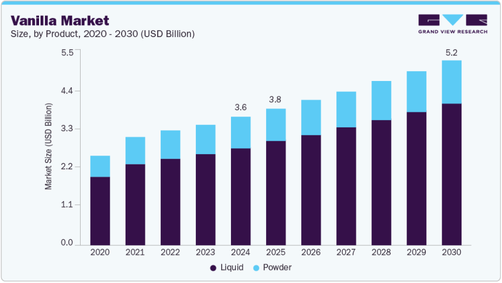 液体バニラは、その汎用性、業界横断的な広範な用途、そして食品メーカーや消費者における利便性と使いやすさへの嗜好の高まりにより、2024年には75.9%という最大の収益シェアを占めました。液体バニラ、特に純粋なバニラエキスは、料理用途での幅広い使用を含むいくつかの利点を提供します。液体バニラは、アイスクリーム、ヨーグルト、カスタードなどの乳製品に広く使用されています。