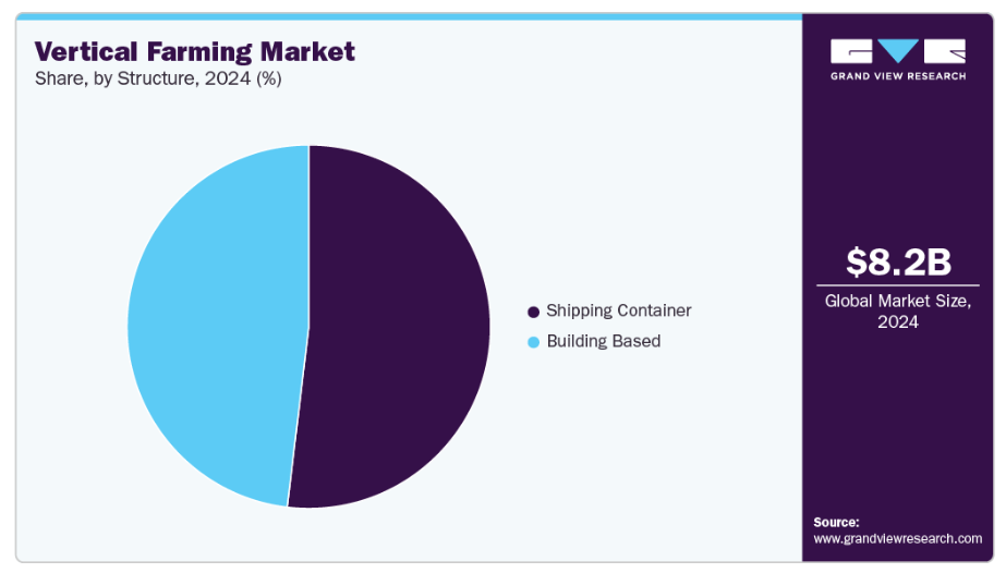 輸送用コンテナセグメントは市場を支配し、2024年には最大の収益シェアを占めました。都市人口の拡大、耕作可能な土地の減少、グローバルサプライチェーンへの圧力増大に伴い、輸送用コンテナセグメントは著しい普及を見せています。コンテナファームは食料生産の地域化を実現し、輸送コストと排出量を削減しながら安定供給を確保します。自動化、気候制御技術、精密農業ツールの最近の進歩は、これらのコンパクトな農業ユニットの効率性と生産性を高めています。モジュール式で容易に展開可能な農業ソリューションへの需要の高まりは、都市部事業者および機関投資家双方にとって、コンテナ型農場を現実的な選択肢として位置づけています。