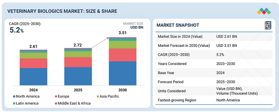 世界の獣医用生物学的製剤市場は、2025年の27億2,000万米ドルから2030年までに35億1,000万米ドルに達すると予測されており、予測期間中は年平均成長率(CAGR)5.2%で成長する見込みです。