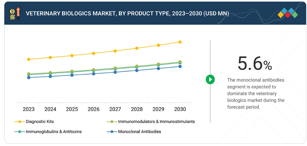 獣医用生物製剤市場のエコシステムは、診断キット、モノクローナル抗体、抗毒素の製造業者をはじめ、研究機関、規制当局、流通業者、獣医療提供者、そして診療所、病院、診断検査室、政府機関などのエンドユーザーを含む、複雑なステークホルダーのネットワークで構成されています。研究開発における協力関係、バイオテクノロジーの進歩、予防的動物医療への需要増加がイノベーションを促進しています。規制当局は安全性とコンプライアンスを確保し、流通パートナーは市場アクセスとコールドチェーン物流において極めて重要です。この相互接続されたエコシステムは、疾病の有病率、家畜・ペットの個体数動向、地域ごとの動物衛生政策の変遷に影響を受けています。