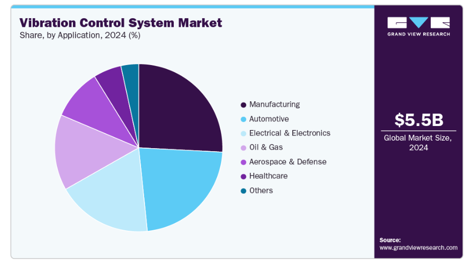 振動制御セグメントは、製造、自動車、航空宇宙、インフラなどの主要産業における機械的安定性と振動隔離の強化需要の高まりを背景に、2024年に59%超のシェアで市場を牽引しました。この需要は、設備性能の向上、騒音や摩耗の低減、厳格な規制・安全基準への対応を目的とした先進的な振動制御技術の採用拡大によって促進されています。