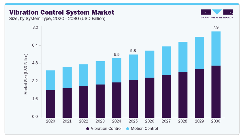 さらに、技術進歩が振動制御システム産業の成長を大きく支えており、スマートセンサー、IoT、AIを統合したアクティブ振動制御システムの革新により、リアルタイム監視と適応型振動低減が実現されています。これにより、半導体製造、自動車安全システム、航空宇宙産業など、精度が要求される分野において、性能向上と予知保全能力の強化が促進されています。加えて、静粛性を求める電気自動車の普及は、振動制御の高度化を必要とするため、振動制御システム産業における採用と革新をさらに促進しています。
