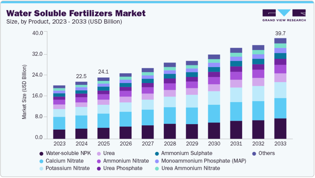 水溶性NPKセグメントは、バランスの取れた栄養組成、施肥灌漑システムとの高い互換性、多様な作物・土壌タイプへの広範な適用性により、2024年に19.9%の最大収益シェアを占めました。カスタマイズ可能な配合により、栽培者は特定の生育段階に合わせた窒素(N)、リン(P)、カリウム(K)の精密な比率を供給でき、植物の健康を最適化し収量ポテンシャルを最大化します。世界的に効率的な栄養素利用と持続可能な農業実践が重視される中、水溶性NPK肥料の需要は特に高付加価値園芸、温室栽培、精密農業システムで急増しています。このセグメントは、様々な地域での汎用性と土壌・葉面用途の両方を効果的にサポートする能力からも恩恵を受けています。