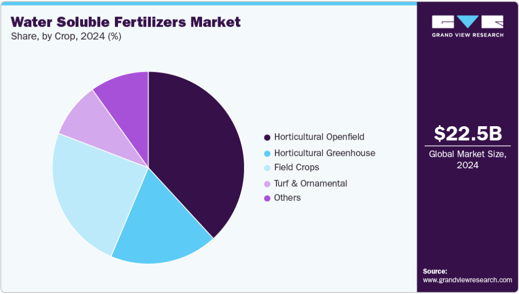 園芸用露地栽培セグメントは2024年に38.2%の最大収益シェアを占めた。これは主に、果物・野菜・その他高付加価値作物が世界的に露地栽培で広く生産されているためである。これらの作物は栄養不足に極めて敏感であり、最適な収量と品質を確保するためには一貫した管理が必要となる。水溶性肥料はこの分野で特に好まれる。肥料灌注や葉面散布による的を絞った効率的な施肥を可能にし、養分損失を最小限に抑えながら植物の吸収効率を向上させるためである。露地園芸は、特にアジア太平洋や中南米などの輸出志向地域において、生鮮農産物に対する消費者需要の高まりからも恩恵を受けている。これにより商業栽培者間での水溶性肥料の大規模導入が進んでいる。
