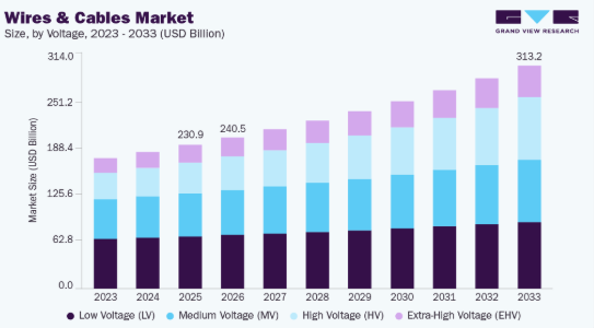 世界の電線・ケーブル市場規模は2025年に2,309億米ドルと評価され、2033年までに3,131億9,000万米ドルに達すると予測されており、2026年から2033年にかけて年平均成長率(CAGR)3.8%で成長する見込みです。