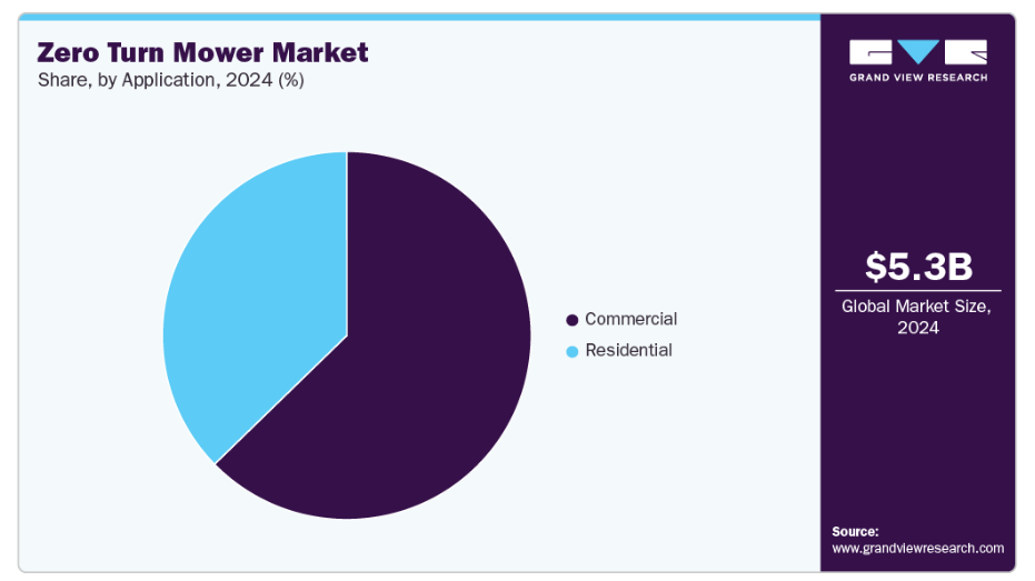 60インチ超のセグメントは、予測期間中に最も高いCAGRで成長すると見込まれています。60インチを超える刈幅を持つゼロターン芝刈り機は、主に速度と効率が重要な大規模商業施設や自治体向けに応用されています。これらの芝刈り機は作業時間を大幅に短縮するため、スポーツフィールド、公園、大邸宅、その他の広大な緑地エリアに最適です。造園事業の規模拡大と、公共・民間セクターにおける契約ベースの維持管理の拡大が、60インチ超の刈幅を持つゼロターン芝刈り機の需要増加を牽引しています。